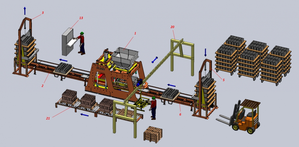 Vibropress designed and conceived for the production of high-quality floors. Specifically intended for manufacturers of self-locking floors, this machine uses the “multilayer system”, and moulds directly on the pallets forming self-supporting packs.